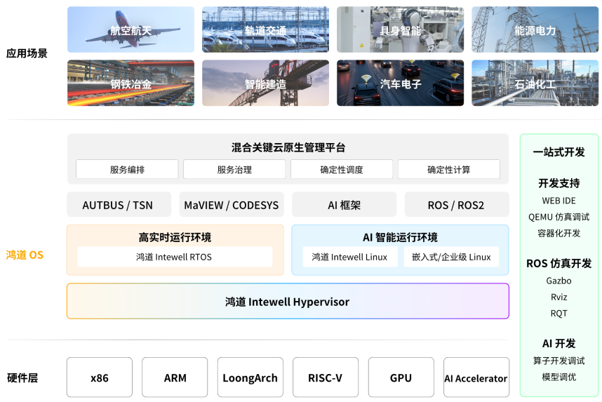 鸿道Intewell操作系统历经 30 多年技术积累,完成了从“单点突破”到“体系崛起”的跨越,支持全球 300+ 软硬件,集操作系统、控制基础软件、通信总线三大工业根技术于一体,形成“硬件 + 操作系统 + 工业软件”的完整智能工业基座技术生态。