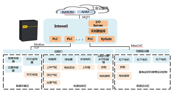 2.边缘计算层:基于软件定义控制理念,以工业服务器为基础,建立虚拟化的控制内核,并基于Autbus二线总线实现与I/O的互通。在这层的部署设计中,利用工业服务器上的虚拟桌面系统,部署KySCADA,实现现场侧数据采集与监视控制系统(SCADA)功能。部署KyGate,实现采集的设备数据和生产数据。