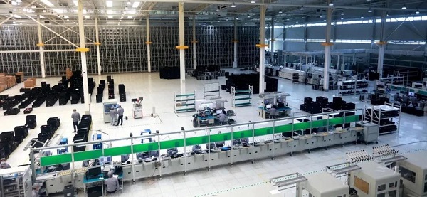 自动化装配线采用赋码工装板在倍速链流水线上流动,实现产品的组装和测试;共15个自动化工位,自动装配线、自动测试线的节拍时间最大25S;装配卡轨产品:2000台/天,机架产品:1000台/天;